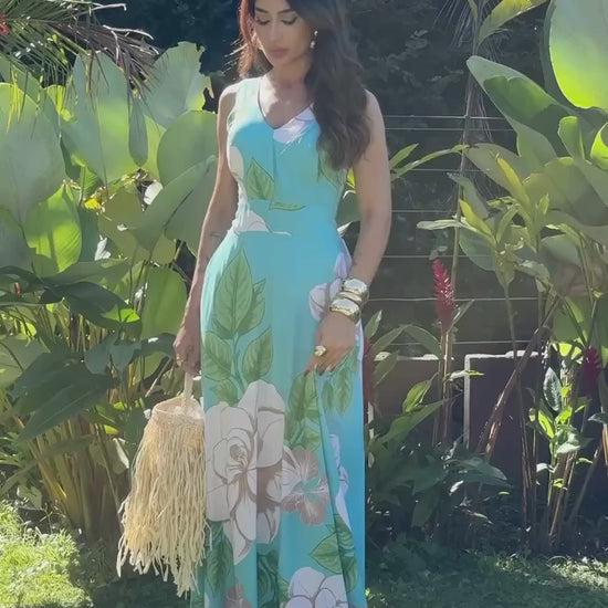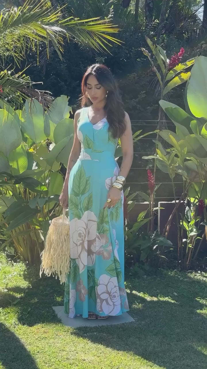 Conheça o vestido que vai te fazer sentir radiante. Com um design elegante, este vestido longo apresenta alças largas e um decote em V que realça o colo de forma sofisticada. Uma estampa floral, com grandes flores em tons claros sobre um fundo azul-claro, é a escolha perfeita para quem busca leveza e romantismo.